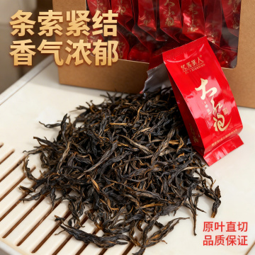 大红袍茶叶卖点展示主图,办公室简约浅色系背景,展示独立红色小包装大红袍,特写突出茶叶包装的质感,重点突出"优选品质"核心卖点。主体为单包红色大红袍茶叶,斜放在浅木桌面上,旁边摆放透明玻璃公道杯,茶汤橙红透亮。文字排版:左侧大字卖点"优选品质",下方小字说明"条索匀整 香气持久",所有文字采用红色无衬线字体,文字不遮挡产品主体,整体风格统一,符合拼多多平台,正方形构图。