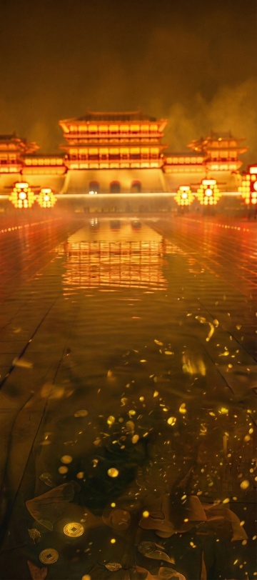 中式古典建筑与红裙女子在夕阳下交织,光影流动,3D重拟物风呈现油画般的唯美感,静谧中透出浪漫梦幻。
