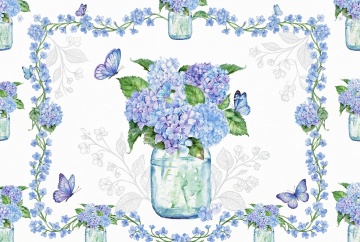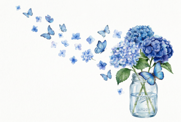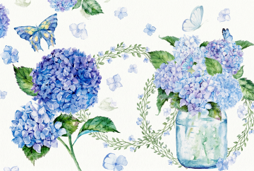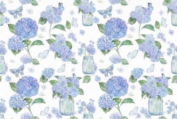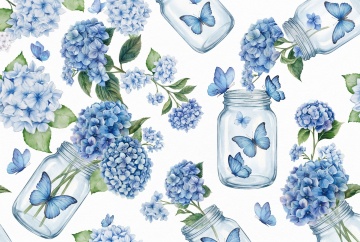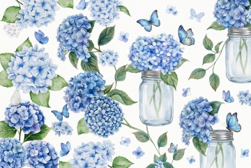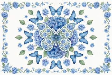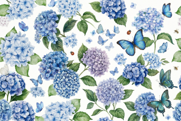 清新治愈的水彩花卉与蝴蝶无缝图案,包含白心橙黄雏菊、明黄色大丽花、紫色薰衣草穗、浅蓝尤加利叶及多种绿色枝叶,点缀橙黑帝王蝶、蓝黑蓝闪蝶,翅膀纹理细腻。水彩晕染色彩清新淡雅,过渡自然,叶片花瓣边缘带露水透明感,元素无规律均匀分布可无缝重复,营造宁静春日花园氛围