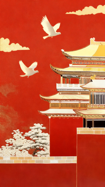国潮风插画,鎏金浮雕质感,红金主调彰显中式奢华与喜庆,古典宫殿与山水相映,梦幻刺绣纹理点缀,尽显节日祥瑞之气。