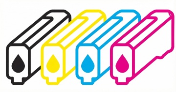 现代感与科技感融合的扁平风设计,采用描边与几何线条勾勒四色墨盒,色彩鲜明,呼应印刷风,简洁中透出视觉冲击力。