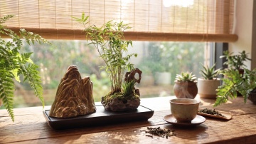 古朴雅致的中式书房场景,暖棕色调木质背景墙,右侧圆形镂空窗格投下斑驳光影,左侧有翠绿植物枝叶自然垂落,桌面上摆放着一个青瓷茶具套装,包括盖碗、公道杯和品茗杯,旁边放着一小罐茶叶和一个竹制茶则,整体光线柔和,营造出宁静悠远的东方禅意氛围,细节精致,质感温润,具有高度写实的摄影风格,突出传统器物的古朴韵味与自然肌理。