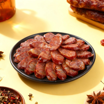 实景感十足的中式腊肠切片,暖光映衬下质感饱满,搭配香料点缀,质朴温馨,重拟物风与美食摄影结合,呈现传统年味。