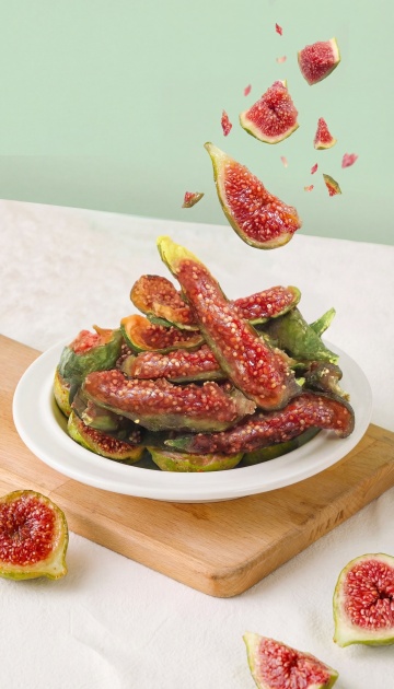 将图中的冻干无花果全部替换为图2的蜜渍无花果干,保持整体场景不变,白色瓷盘、浅木色砧板、浅绿色背景都保留,无花果干的形态和图2一致,半透明蜜渍质感,果籽清晰,光影匹配背景的柔和漫射光,自然融合,有食欲感