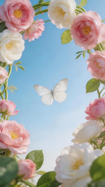 梦幻感水彩风玻璃杯漂浮于花海,3D虚拟自然场景,清透柔美,蝴蝶翩跹,春日浪漫氛围。