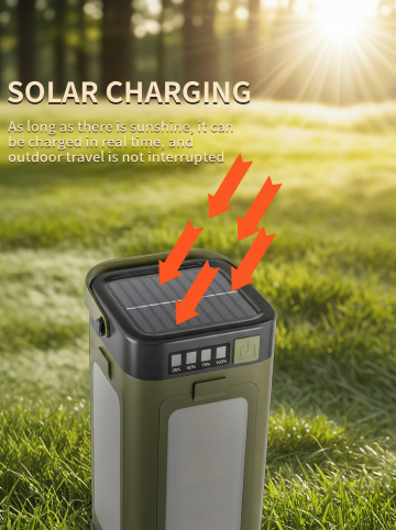 实景感与科技感融合,3D风呈现智能太阳能管理系统,金属质感设备嵌入自然露营场景,虚拟自然中展现清新舒适体验。