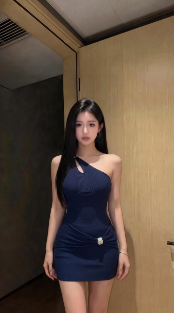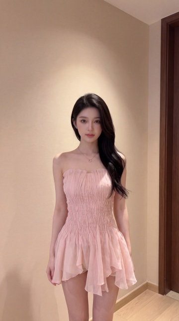 保留图3中人物的头部和黑色长直发型,将人物穿搭替换为米白色露肩蕾丝拼接缎面短裙,去掉包包,双手自然下垂,调整为模特般纤细腰肢和好身材比例,将背景替换为图4的室内浅米色墙面的简约室内场景,呈现半身画面