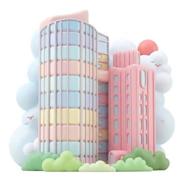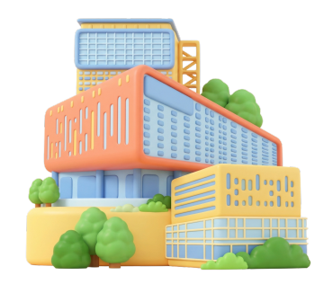 2.5D 图标、可视化风格、中间有主体建筑、周围有附属建筑、 毛玻璃风格、科技蓝、细节简洁、背景透明、智慧城市