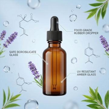 清透玻璃瓶身搭配简约白色滴管盖,3D渲染呈现现代科技感,重拟物设计凸显质感,极简风格呼应未来美学。生发精油瓶概念图模型图,白色瓶嘴瓶盖,透明瓶身