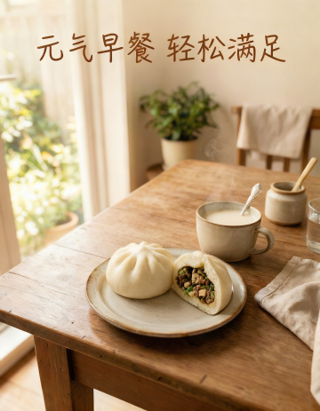 [主图3]盼盼老式面包食用场景展示,早餐场景,一块手撕面包放在白色瓷盘上,旁边搭配一杯热牛奶,自然光从窗边洒入,营造温暖治愈的居家早餐氛围。右下角悬浮文案 "早餐下午茶 营养好选择",字体为浅棕色。整体风格统一,保持暖调自然光,突出产品作为日常早餐的适配性,唤起生活场景联想。