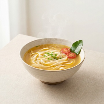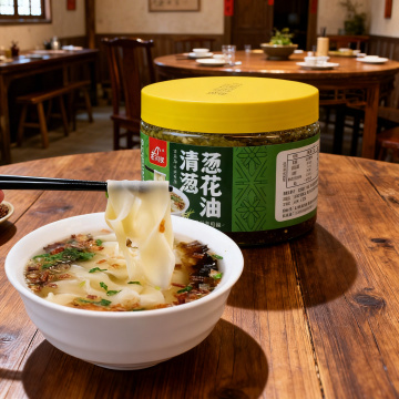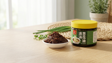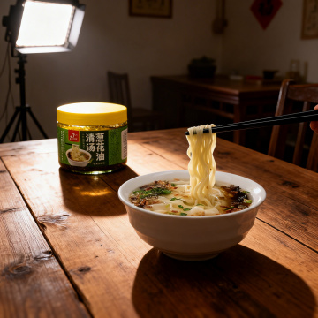 一张氛围感电商场景图,画面主体是一碗酸汤扯面,旁边放着一罐清汤葱花油。保持葱花油产品上的文字"老冯家""清汤葱花油""老冯家食品"原样,保持产品主体物理结构不变。风格为东方禅意新中式,采用自然侧光,粗陶原木材质,整体低饱和度暖色调,柔和漫射光影,食欲感满满。画面构图为三分法,有大面积留白,保持整体温馨治愈的种草氛围感,整体明亮干净通透。