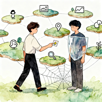 插画风扁平设计,融合科技感与商务感,轻拟物元素展现虚拟现实编程场景,体现简约主义配色突出未来感,玻璃风界面增强视觉层次。
