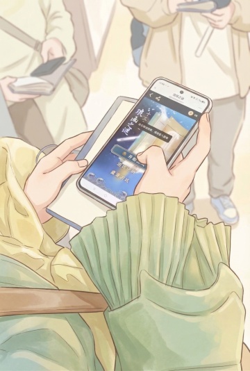 梦幻插画风,超现实主义设计,少年凝视卷轴堆,星月环绕,营造神秘氛围。