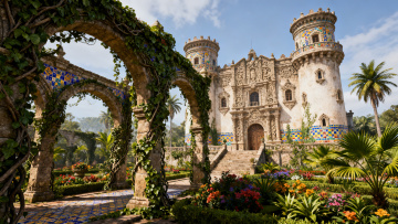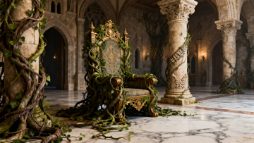 超广角镜头,一座被远古藤蔓半掩的中世纪石砌城堡厚重橡木大门,深褐色木纹中镶嵌着生锈的铁制十字铰链,门上对称分布着四个菱形彩色玻璃窗,中央悬挂着巨大的青铜门环,两侧是爬满常春藤的灰色石墙,门后透出摇曳的烛火暖光,门前石阶上散落着几片深红枫叶,黄昏的金色阳光斜照在门扉上,空气中漂浮着微尘与古老木头的气息,整体色调是沉稳的赭石色与温暖的琥珀色交织,营造出神秘而庄重的历史感。