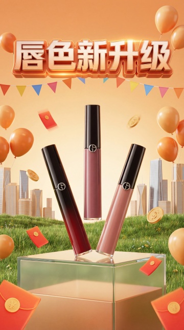 水彩风背景晕染喜庆红,鎏金灯笼点缀中式感,3D重拟物精华瓶透出清透奢华,新年焕肤主题尽显节日氛围。