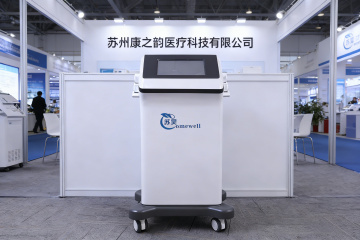 科技感与现代感交融的展台设计,采用蓝白双色搭配,融合扁平风与轻拟物元素,金属质感与玻璃材质凸显商务与未来气息,简约主义呈现专业医疗品牌形象。