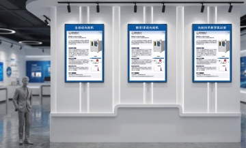 科技感十足的3D展厅,金属风展板搭配简约主义设计,虚拟现实元素融入商务场景,展现现代光刻技术教学实训的高端视觉体验。