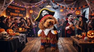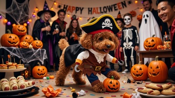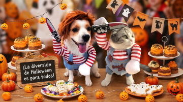 万圣节主题游乐园,4个角色,女巫、骷髅、小怪兽、稻草人在旋转木马旁欢笑。上方有 “Trick or Treat” 的彩色气球拱门,点缀着蝙蝠和南瓜灯,背景是绚丽多彩的游乐设施,整体风格欢乐又梦幻。