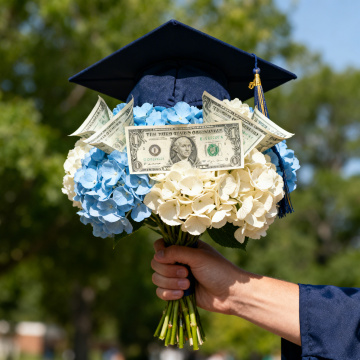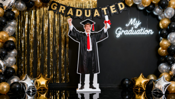 和参考图风格、内容高度相似的毕业邀请函展示图,黑人男性毕业生穿着学士服,双手持毕业邀请函,背景是户外毕业派对场景,有红黑金配色的气球和毕业装饰,阳光明媚氛围欢乐,邀请函内容、设计与参考图完全一致,文字清晰