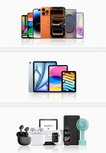 一个纯色背景上的系列4元素规整排布3D渲染科技产品集合,包含智能手机、智能手表、VR眼镜和充电宝,保持原图的高质量3D建模风格、金属与塑料的质感表现、简洁现代的设计语言、细致的光影效果和清晰的结构细节,整体色彩变换为全新色系,元素内容完整保留,呈现出专业、统一且具有科技感的产品展示效果,视觉层次分明,信息传达高效,符合现代科技产品宣传的设计感。