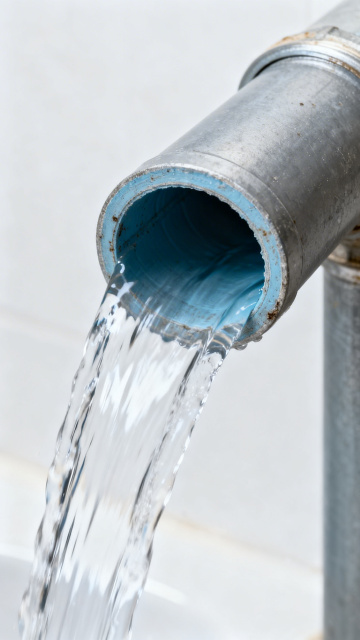 一张以不同画面的水龙头为背景的写实风格摄影照片,画面主体为一个亮银色的金属水龙头,水龙头正流出清澈的水流,水流在白色的洗手池表面形成柔和的水花和水痕。水龙头设计有精致的旋钮和弯曲的出水口,金属表面光滑且有细腻的反光,展现出良好的质感。背景中可以看到模糊的绿色植物和木质纹理,光线从左侧窗户射入,形成柔和的自然光效果,整体氛围清新、宁静、生活化,具有温暖的居家感。画面焦点清晰地落在水龙头和水流上,背景适当虚化,突出主体。
