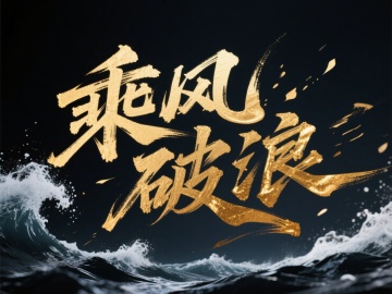 鎏金大字风书法“乘风破浪”,融合水墨飞溅与金属质感,浪涛翻涌背景强化冲击感与体积感,国潮风设计传递热血励志精神。