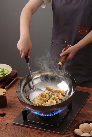 不锈钢漏勺中盛放着煮好的面条,正在给面条沥水,水滴正从孔洞中滴落。保持漏勺主体物理结构不变,保持漏勺圆润外形不变,保持手柄上的文字"麦谷港"原样不变,漏勺不能变形扭曲。场景是温馨的厨房操作台,经典侧逆光勾勒轮廓,柔和漫射光补光,整体明亮干净,低饱和度暖白配色,商业高调摄影,呈现不锈钢金属清晰硬朗高光,画面有前中后景层次,三分法构图,保留自然水滴动态效果,厨房氛围温馨治愈,画面极度细腻写实。