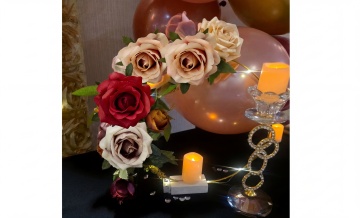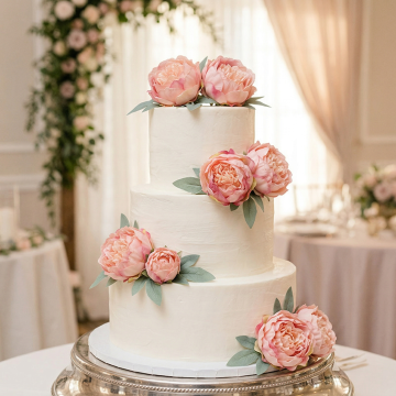 将图2蛋糕上的所有花朵替换为图1的花朵,图1花朵的颜色、大小保持不变,图2中除花朵外的所有元素(蛋糕、珍珠装饰、金色插签、背景粉色花、托盘等)全部保留不变,保持原场景的光影和质感