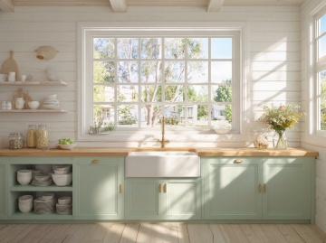极简风格厨房设计,自然光透过窗户形成温暖柔和的光影效果,浅米色墙面搭配原木色台面与搁板,白色橱柜带有简约的圆形把手,搁板上摆放着白色陶瓷罐、木质容器和白色马克杯,台面上立着两块不同尺寸的浅木色砧板,左侧有一个装有木质餐具的白色小罐,整体色调以原木色和白色为主,营造出干净、明亮、温馨且充满生活气息的北欧风厨房空间,细节清晰,质感细腻,构图平衡,光线层次丰富。