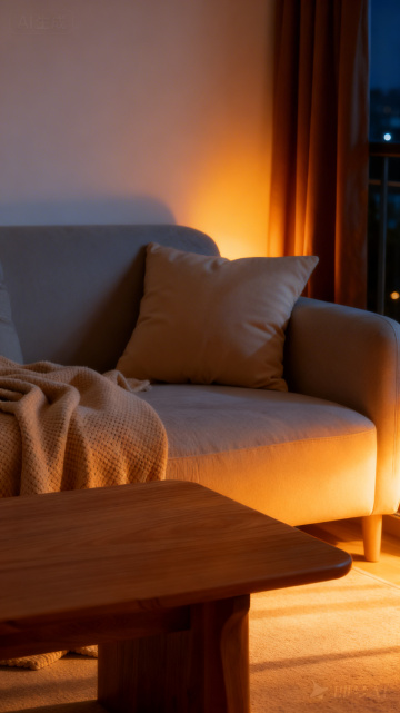 明亮通透的室内场景,整体采用简约北欧风格设计,以米白色、浅木色为主色调,搭配柔和的暖黄色自然光透过半透明白色纱帘洒入室内,在地板和家具上形成清晰的光影条纹,营造出温馨舒适、宁静惬意的氛围。房间内摆放着浅米色布艺沙发,搭配圆形浅色地毯,旁边是原木色边几和带有金属支架的储物柜,墙角立有绿植盆栽增添生机,墙上挂着简约装饰画,整体布局简洁有序,线条流畅,空间感开阔,细节处体现出自然、质朴的生活美学。