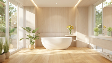 极简主义风格浴室设计,柔和的米白色墙面,温暖的自然光透过白色窗帘洒入,形成柔和的光影效果,地面铺设浅色大理石瓷砖,中央放置一个造型简约的独立式白色浴缸,黄铜色金属水龙头,浴缸旁地面随意摆放一条浅灰色柔软毛巾,右侧角落有一盆绿色植物置于编织篮中,整体氛围宁静、优雅、舒适,布局简洁开阔,空间感强,材质质感细腻,色彩和谐统一,营造出高级而温馨的沐浴环境。