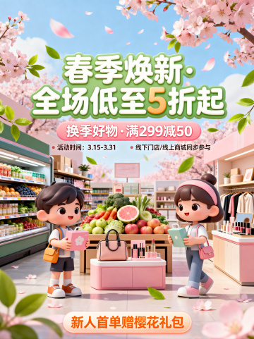 软3D风卡通人物置身樱花纷飞的超市场景,融合清新梦幻的春季氛围与促销信息,营造可爱温馨的购物体验。
