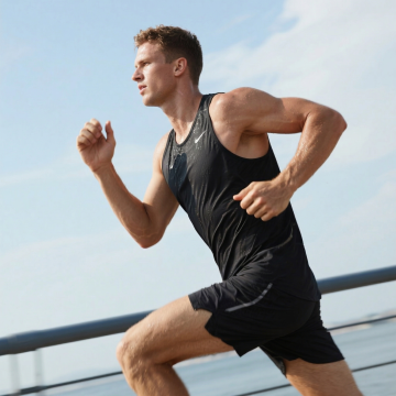 写实风格摄影,一名穿着深色运动背心和黑色短裤的男性正在奔跑的背影,肌肉线条分明,姿态充满动感与力量,跑鞋细节清晰可见,阳光从侧后方照射,在人物身上形成明亮的轮廓光和明显的阴影对比,画面整体色调温暖,以金色和蓝色为主,高清晰度,细腻的质感表现,将原有的乡村道路环境改为清晨的城市滨江步道,地面铺设平整的灰色塑胶跑道,道路一侧是波光粼粼的江面,另一侧是整齐的绿化带和路灯,远处可见城市的天际线和朦胧的晨雾,保持原有的逆光拍摄角度和阳光效果,营造出清新、充满活力的运动氛围。