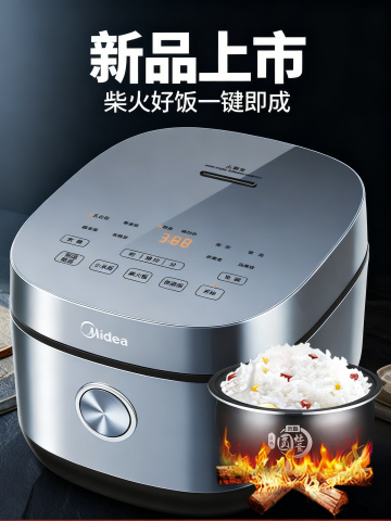 米白色电饭煲,周围环绕厨房台面及新鲜食材(白米、稻穗、绿叶蔬菜),现代简约风格,温馨自然氛围,明亮柔和光线,高清质感,白色背景的要求,