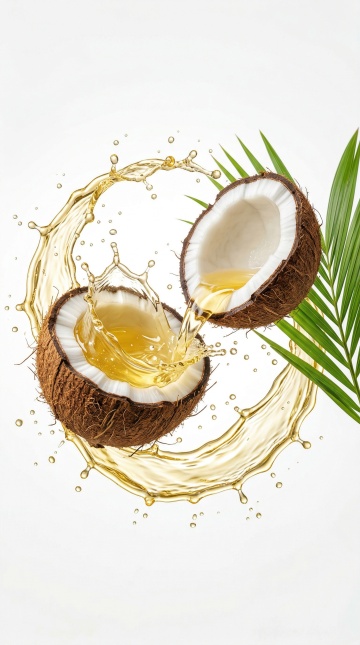 写实商业产品摄影风格,中景,棕白黄绿清新自然色调,平拍视角,椰子油展示场景(两个对半切开的带壳椰子 椰肉洁白 下半椰壳盛有金黄椰子油 金黄油液呈动态飞溅环绕状 油滴晶莹 旁有一片翠绿椰叶),油液动态飞溅 椰壳悬浮,天然纯净的植萃护肤氛围,8K 超高清 画面清晰锐利(椰壳纤维纹理 椰肉细腻质感 油液通透光泽 叶片脉络),柔和柔光打光 逆光勾勒油液轮廓 高光凸显油滴通透感 明暗层次分明,纯白极简背景