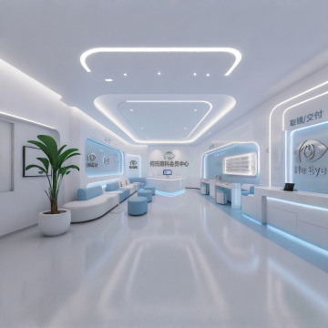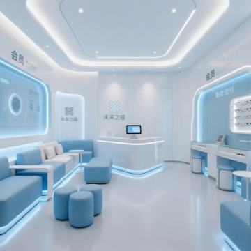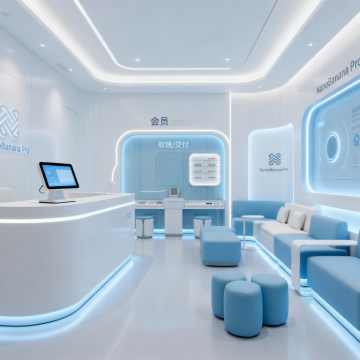 极简主义构图,全景视角下的未来生物实验室,纯净的白色与冰川蓝构成的无菌空间,墙面采用无缝纳米陶瓷板拼接,地面是反光率达95%的超白玻璃材质,顶部悬浮着呈几何阵列排列的环形LED光源,光线均匀地洒落在所有表面。左侧是模块化悬挂式试剂架,透明亚克力容器中装着梯度蓝色的生物试剂,下方嵌入式实验台配备隐藏式智能控制面板。中央区域放置着一台六边形结构的量子分析仪器,金属外壳呈现细腻的哑光钛白色。右侧墙面上的生物安全柜采用隐形门设计,与墙面融为一体。整个空间无任何视觉噪音,连空气都仿佛凝固在绝对静止中,只有试剂瓶上的分子结构标签在微光下隐约可见,完美平衡了科技冷感与空间美学,为内容展示提供极致洁净的背景画布。