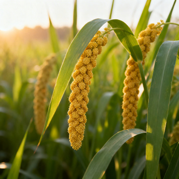 清晨阳光下的小米种植田,饱满金黄的小米穗低垂在翠绿修长的叶片间,近景特写小米颗粒的细腻质感,背景虚化的绿色禾苗形成自然景深,柔和的侧光勾勒出谷物的轮廓光,温暖的色调展现丰收的生机与自然纯粹之美,突出小米作物的原生态与营养价值。