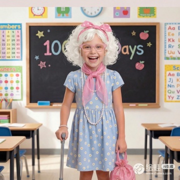 保留小女孩佩戴的所有珍珠饰品(珍珠发箍装饰眼镜、珍珠项链、珍珠手链),更换为可爱爱笑的小女孩,小女孩拄着拐杖站在教室黑板前,黑板上写着"100 Days",更换女孩衣服为可爱风格裙子,整体氛围明亮快乐充满校园感