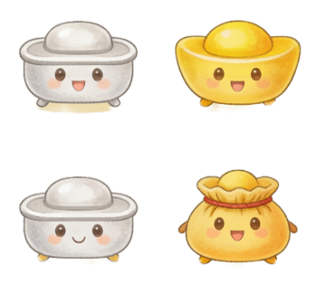 一组4个完全不同元素内容的黄金系列素材集合,保持3D立体风格,采用纯色背景,每个元素都有高光泽度的金黄色金属质感,清晰的边缘轮廓和明亮的反光效果,规整排布,元素包括:交叉的金条、堆叠的金币、金元宝和金砖,整体色彩变换但保持金色调,画面简洁干净,无任何文字和二维码。