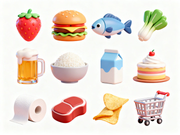 可爱感与卡通感交融的软3D风格食物图标,融合体积感与轻拟物设计,呈现塑料风质感,适合节日购物主题视觉表达。