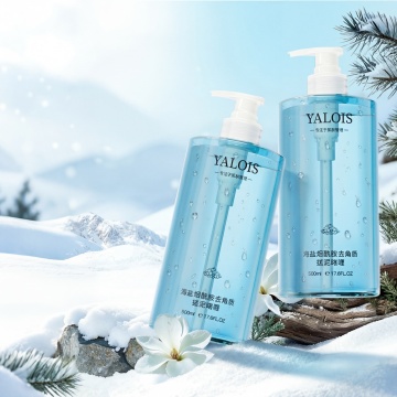 清新蓝调背景,泡沫环绕瓶身,轻拟物风搭配玻璃质感,展现清爽洁净的现代美学。