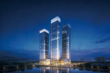 高端酒店外观夜景,现代简约建筑风格,主体为高耸的米灰色玻璃幕墙大楼,顶部及裙楼边缘有温暖的金黄色灯带勾勒轮廓,大量明亮的窗户透出内部灯光。建筑前方有平静的水池,完美倒映出建筑的灯光与轮廓,水面泛着金色涟漪。周围点缀着茂密的绿色树木,底层设有带遮阳伞的露天休息区。天空呈现深邃的蓝紫色渐变色,营造出宁静、奢华、大气的氛围,专业摄影级画质,清晰的细节和光影层次,高分辨率。