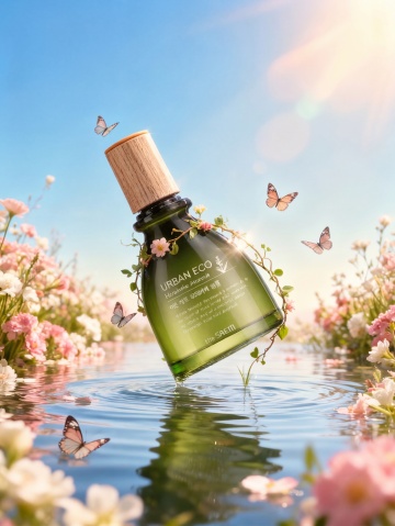 清新玻璃瓶置于虚拟自然水景中,花影轻舞,尽显清爽与清透感。