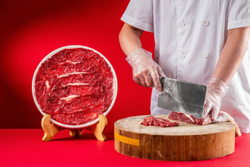 一位穿着黑色围裙的男性厨师,双手正握着一把锋利的厨刀,在木质砧板上精准地切割新鲜的红色生肉块,砧板上和旁边的竹篮里也堆放着多块纹理清晰的肉块,整体画面采用暖色调自然光摄影风格,光线从斜上方照射,突出肉块的鲜嫩质感和厨师手部的肌肉线条,背景为简洁的深色木质墙面,营造出专业、质朴且充满生活气息的厨房环境,高分辨率细节清晰,无任何文字和水印。