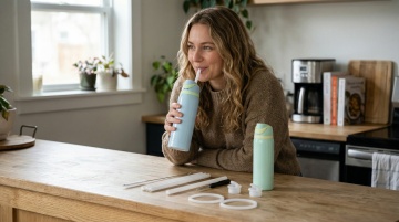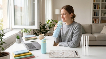 现代感办公场景,清新舒适,性冷淡风设计,轻拟物风水杯点缀,简约时尚。