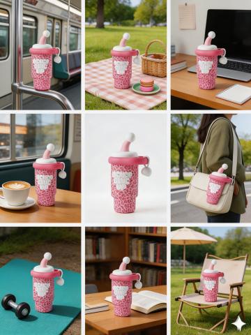 奶油色水壶搭配蓝白波点与格纹,扁平风与轻拟物结合,点缀心形挂饰,清新甜美,柔软舒适,节日氛围感十足。