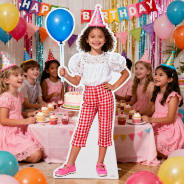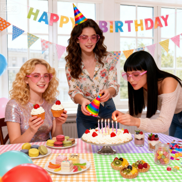 喜庆感十足的儿童生日派对,卡通风格与实景结合,轻拟物风装饰搭配拼贴元素,梦幻清新,充满欢乐氛围。