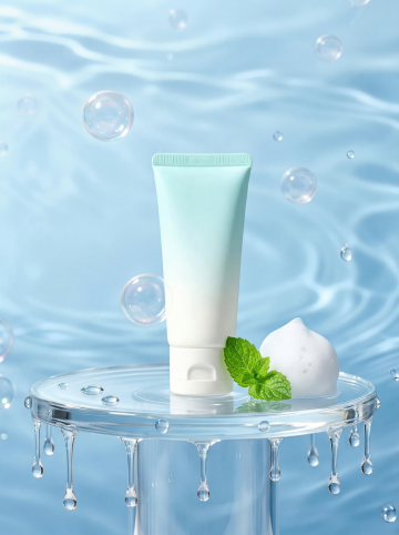 清新蓝调水波背景,3D液态玻璃质感台面,搭配薄荷与泡沫,营造清透清爽的夏日护肤氛围。
