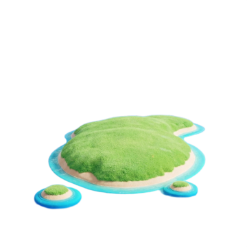 清新软3D风,卡通感海岛场景,椰树、躺椅与冲浪板,夏日度假氛围。