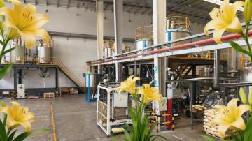 现代主义风格工厂建筑,简洁的白色几何体块外观,大面积玻璃幕墙入口,整齐排列的条形窗户,开阔的混凝土广场,道路旁点缀着几棵高大的绿树,晴朗的蓝色天空中飘着少量白云,光线明亮柔和,阴影清晰,整体呈现出干净、专业、高效的工业氛围。